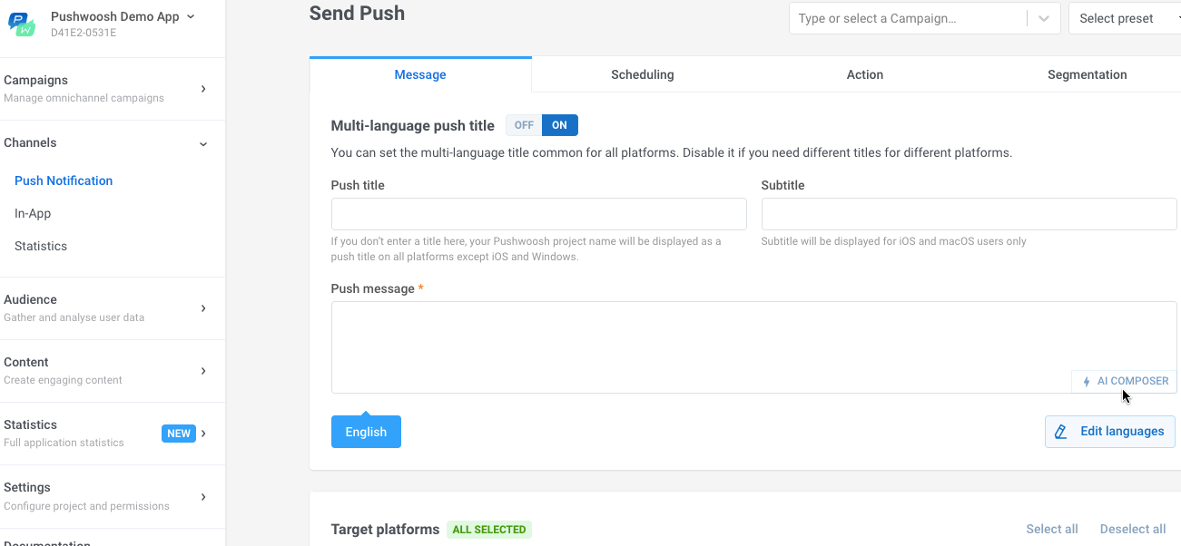 We are excited to announce AI Composer – our new content generation feature! With AI Composer, you can easily create engaging, relevant copy for push notifications in just a few clicks. Simply input your desired keywords and let AI do the rest by generating high-quality copy that is sure to grab your audience’s attention.