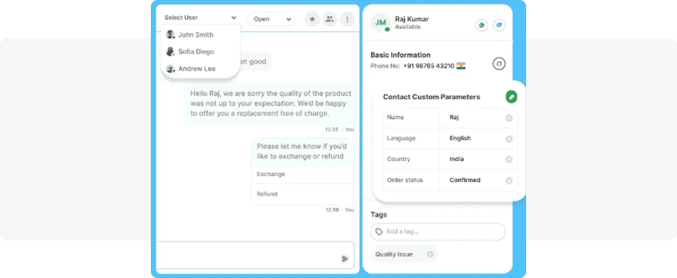 - Multi-agent support: allows multiple agents to manage customer interactions simultaneously on a single WhatsApp number.
