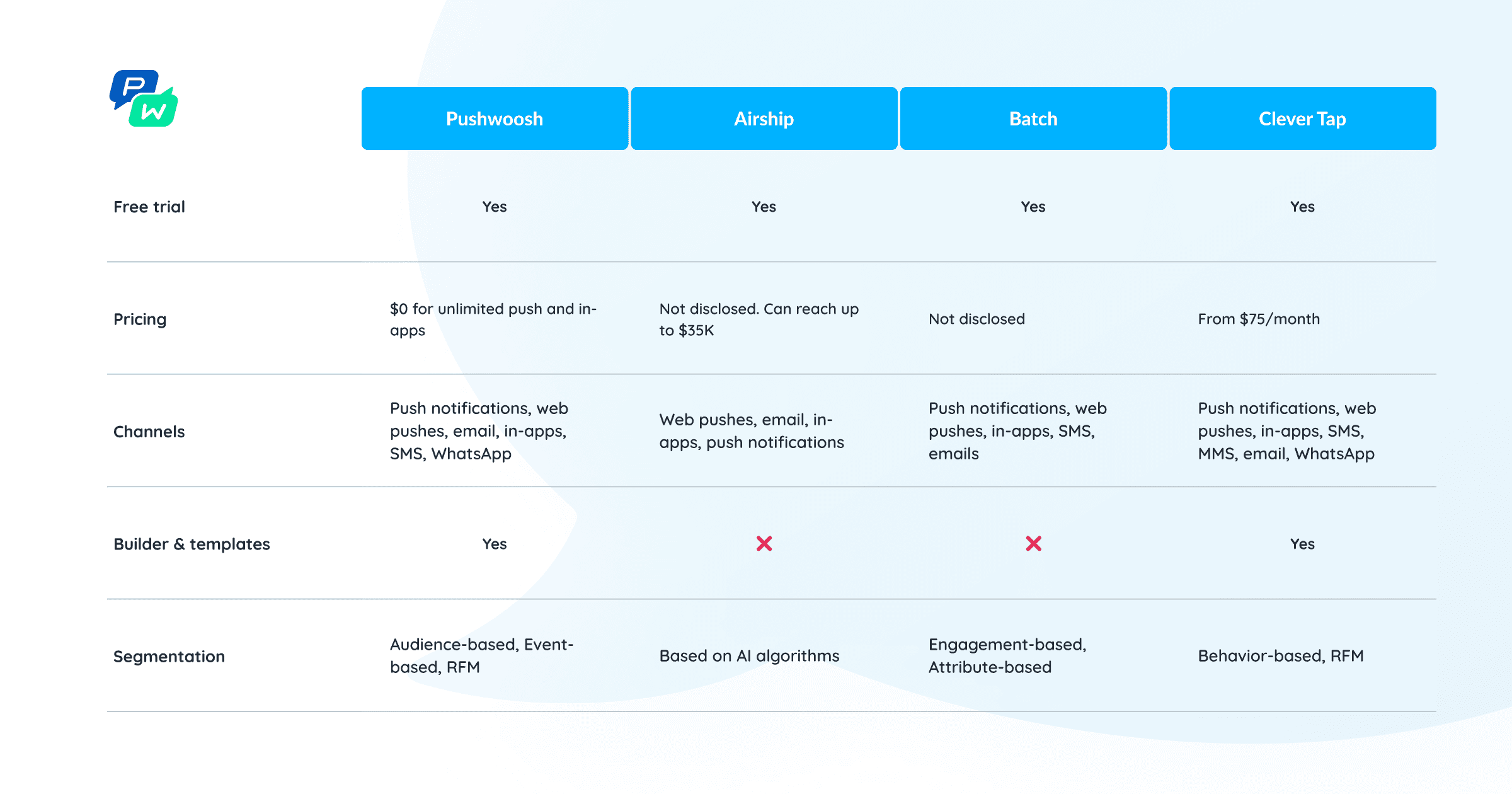 🆚We can continue, but it will be much easier for you to check out this Pushwoosh vs. CleverTap comparison page.