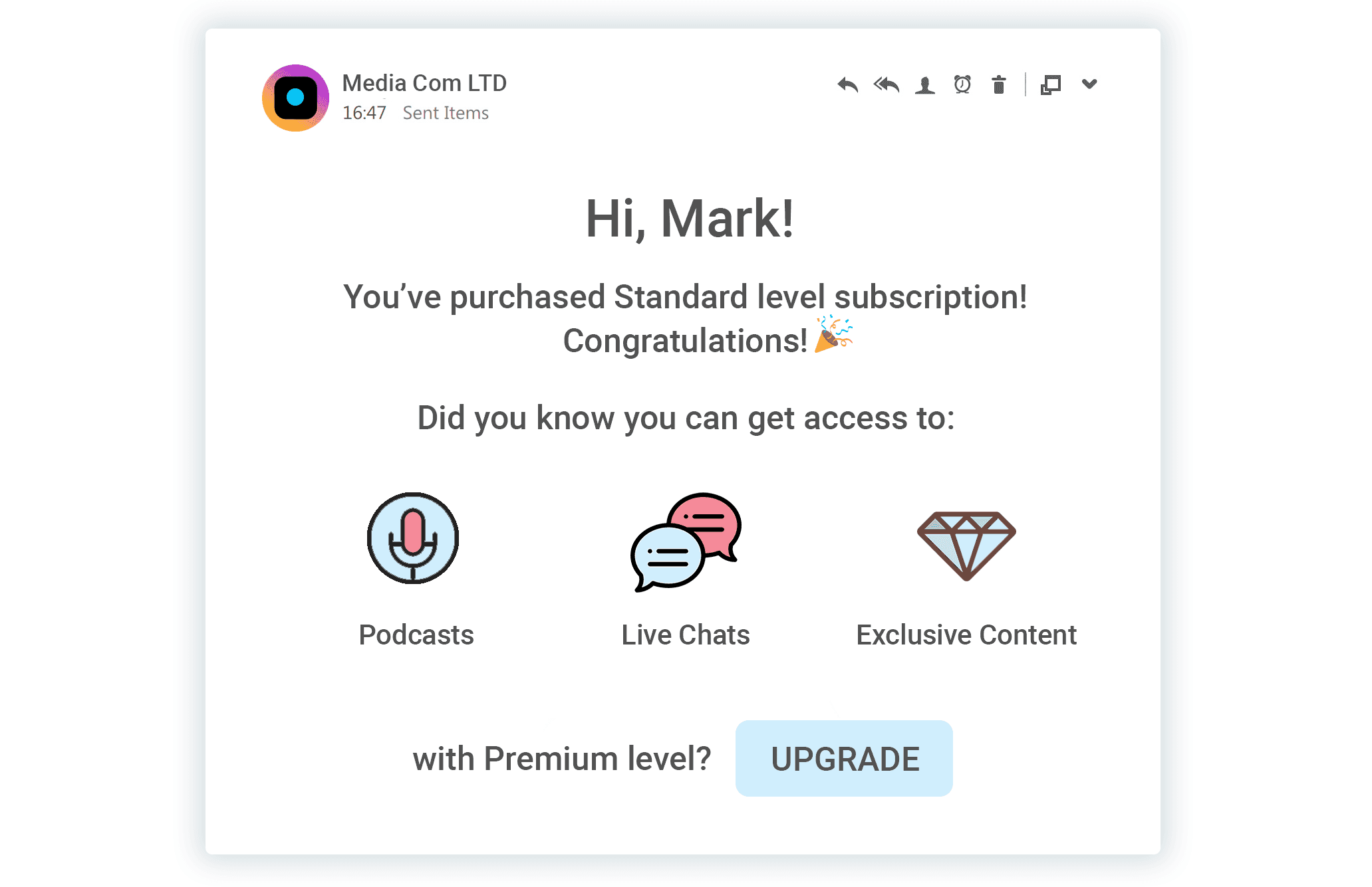 Let’s suppose your user has just bought your standard-level subscription. Deliver a confirmation email that tells them about the benefits of your premium-level subscription. There’s a chance that some users will decide to upgrade (if not now, then in the future), having read about the additional value of a more expensive subscription plan.