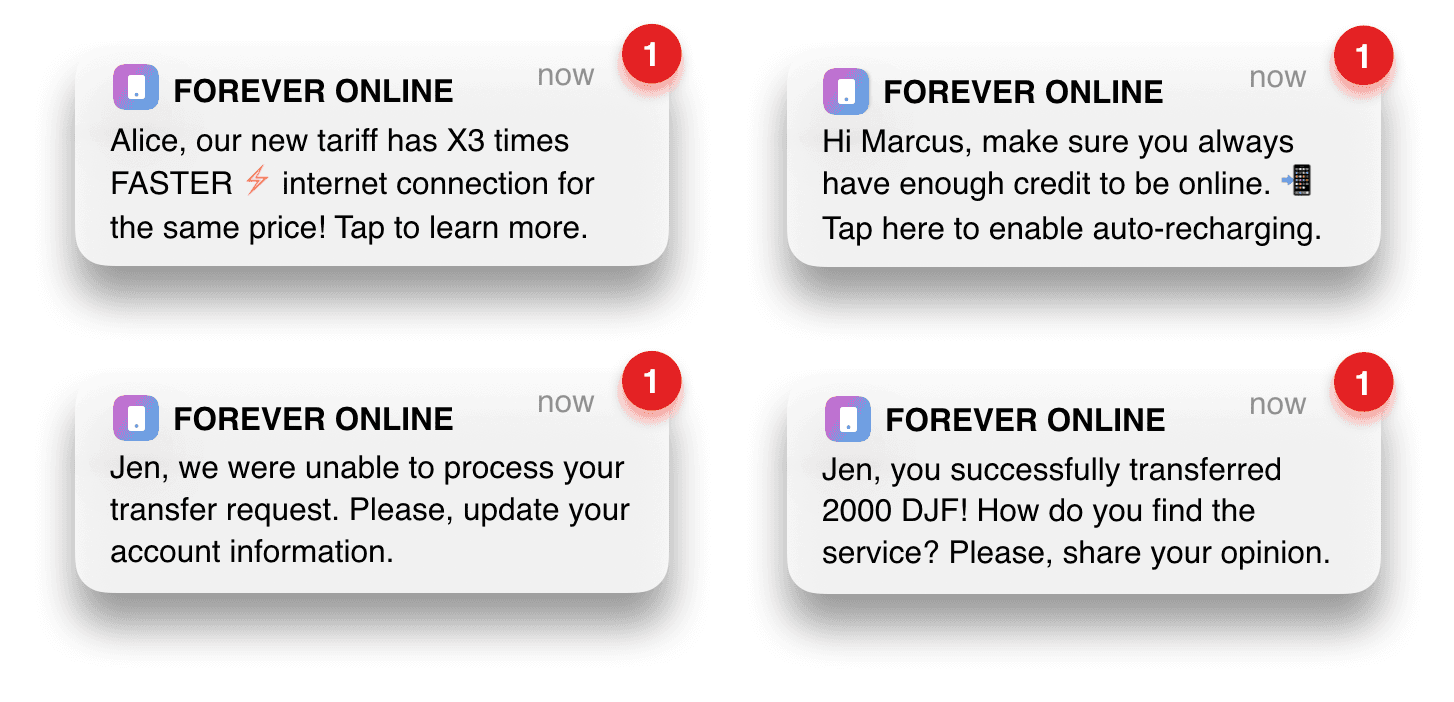If you want your customers to stay active, you need to constantly improve their experience. Relevant and well-timed messaging is an essential part of that. It helps customers stay informed, avoid questions and confusion. You can use emails for transactional messaging, deliver special offers and personalized promotions via push notifications/emails, introduce and showcase new features via in-apps.