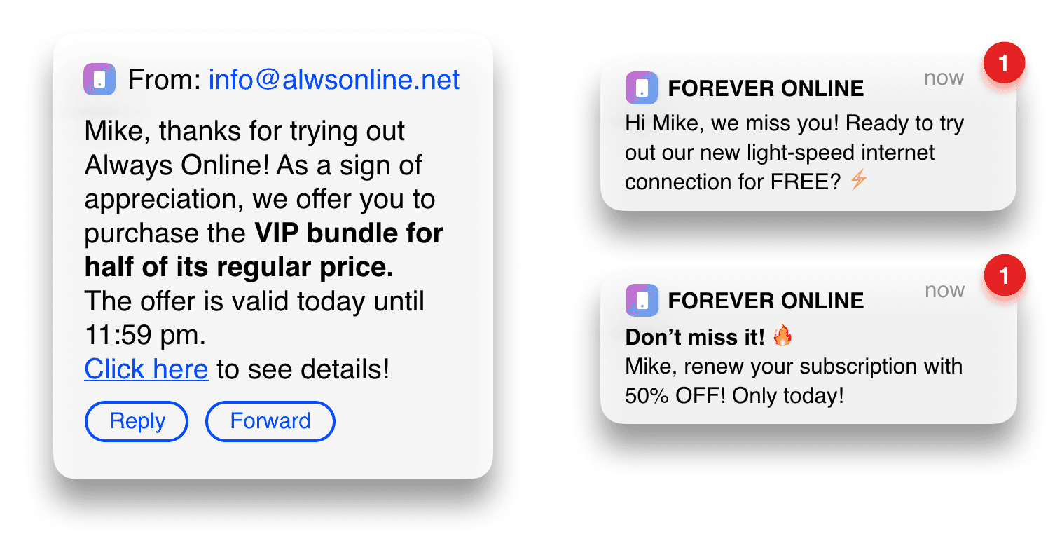 All of your user acquisition efforts are pointless if you cannot retain newcomers and keep them active. That’s where push notifications and emails come to the rescue. These communication channels are highly effective for user retention and preventing churn.