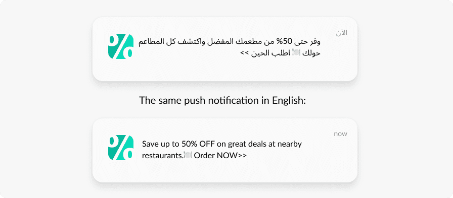 - Personalization: differentiating messages by language: if a user speaks Arabic, a message will be sent in Arabic; otherwise the message will be sent in English;
