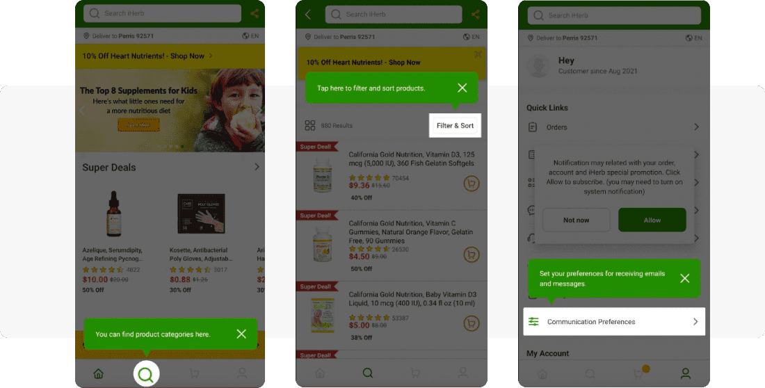 iHerb shows an in-app message suggesting users opt in for their push notifications and/or emails.