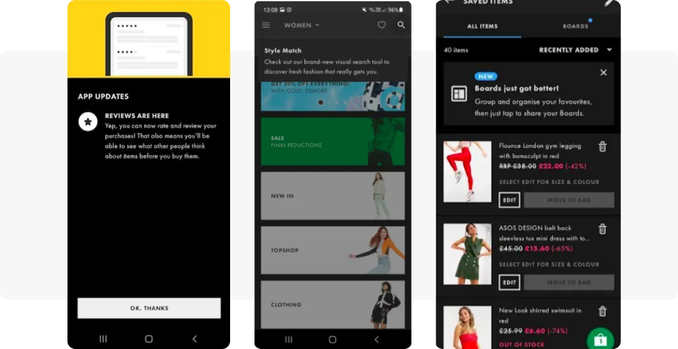 ASOS নতুন ফিচার প্রচারের জন্য বিভিন্ন ধরনের ইন-অ্যাপ মেসেজিং ফরম্যাট ব্যবহার করে: ফুল-স্ক্রিন, স্টিকি এবং ইনলাইন ইন-অ্যাপ।