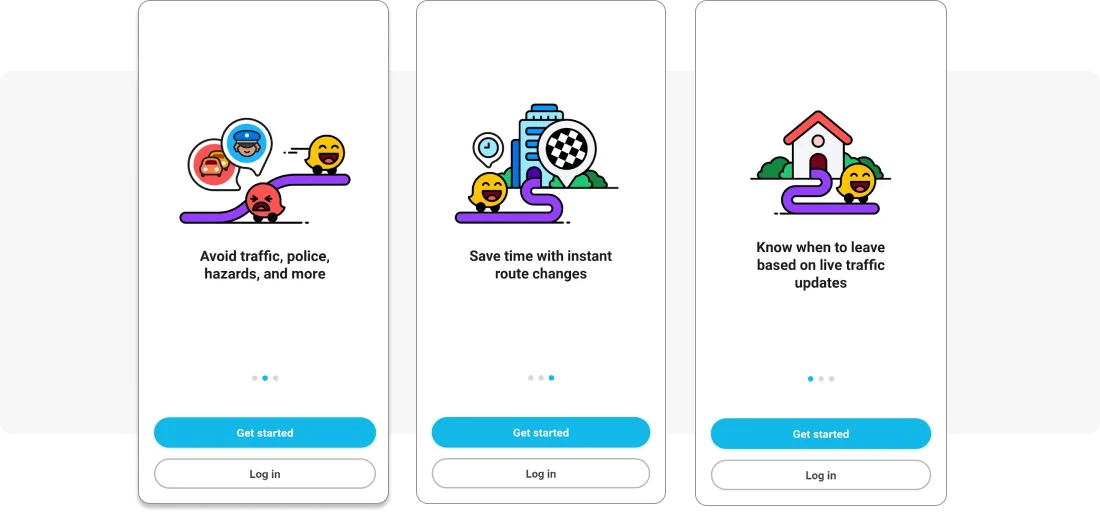 Waze তার অনবোর্ডিং ফ্লো ইন-অ্যাপ স্টোরিজ হিসাবে ডিজাইন করেছে। তাদের তিন-অংশের স্লাইডারটি ডিফল্টরূপে অ্যানিমেটেড, তাই অ্যাপটি যে পরবর্তী ভ্যালু উপস্থাপন করে তা দেখার জন্য ব্যবহারকারীকে কোনো পদক্ষেপ নিতে হয় না।