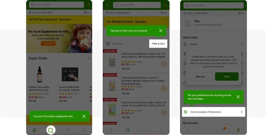iHerb একটি ইন-অ্যাপ মেসেজ দেখায় যা ব্যবহারকারীদের তাদের পুশ নোটিফিকেশন এবং/অথবা ইমেলের জন্য অপট-ইন করার পরামর্শ দেয়।