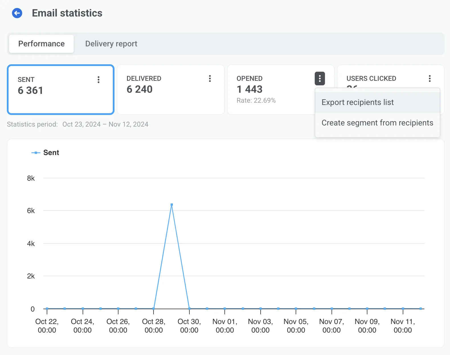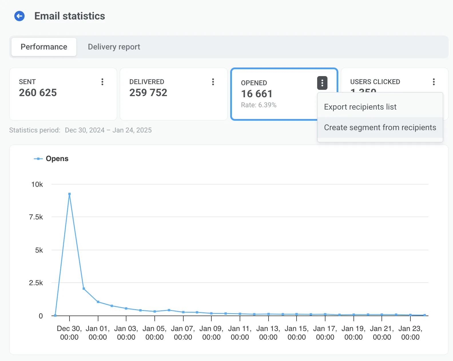 - Gesendet, zugestellt, geöffnet und von Nutzern geklickt, mit der Möglichkeit, E-Mail-Adressen und Benutzer-IDs der Nutzer zu exportieren.