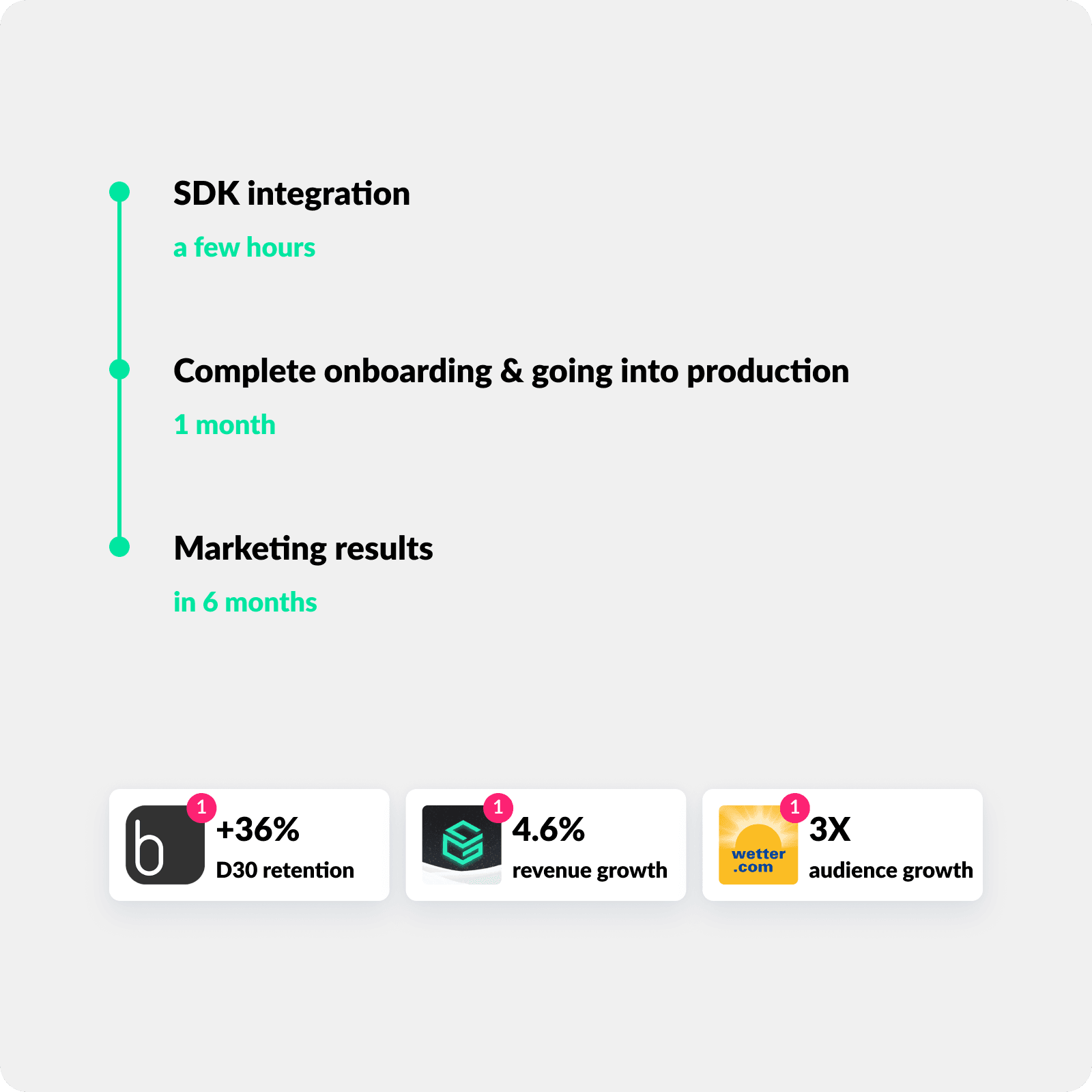 Pushwoosh provides a quick setup without a single line of code — start working on your marketing communications right after the integration.