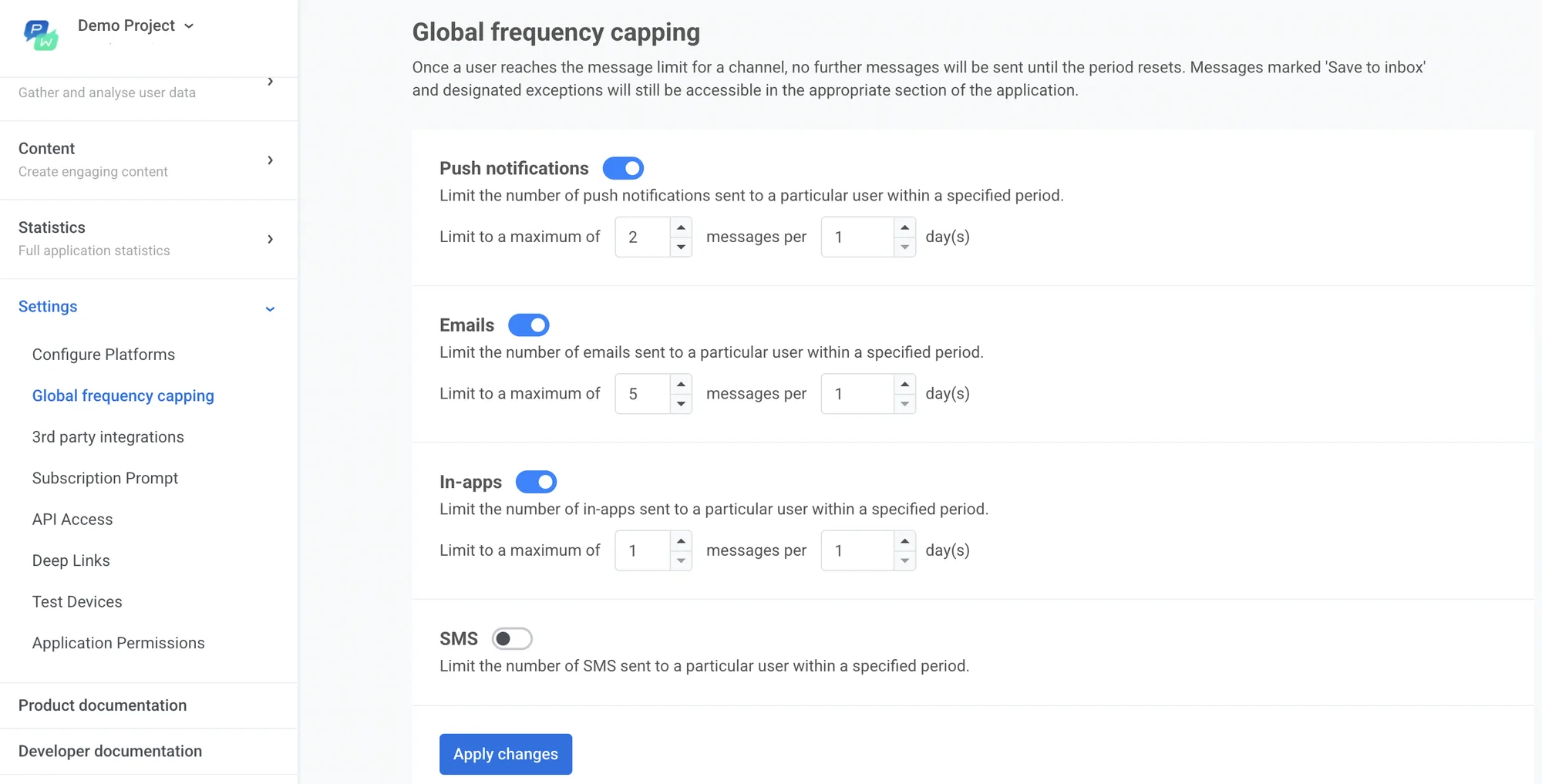 Если вы используете и Customer Journey, и мгновенные in-app сообщения, убедитесь, что не перегружаете пользователей своими сообщениями. Используйте Глобальные лимиты частоты отправки (Global frequency capping), чтобы установить дневные ограничения на количество in-app сообщений и других видов сообщений, отправляемых пользователю.