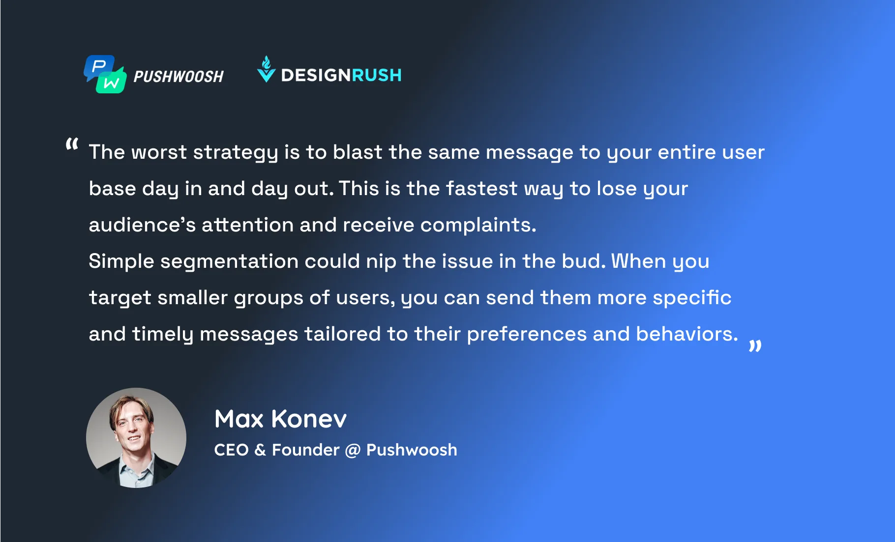 เพื่อให้ได้รับประโยชน์สูงสุดจากแนวทางนี้ ให้ใช้แพลตฟอร์มข้อมูลลูกค้า (CDP) ที่นำไปปฏิบัติได้จริงแทนเครื่องมือแบ่งกลุ่มพื้นฐาน CDP ของ Pushwoosh ช่วยให้คุณจัดการและเปิดใช้งานข้อมูลผู้ใช้อย่างมีประสิทธิภาพในช่องทางต่างๆ โดยไม่ต้องตั้งค่าด้วยตนเองที่ยืดเยื้อและซับซ้อน