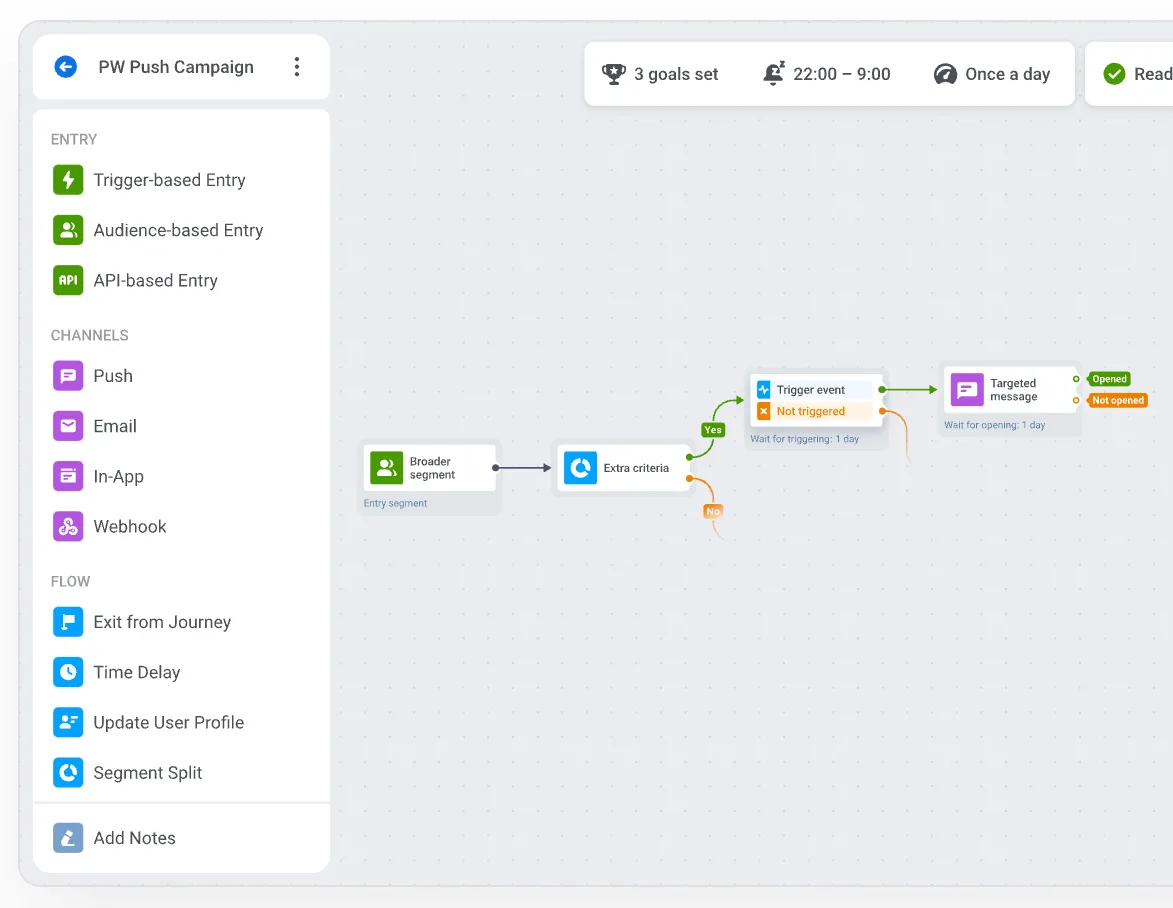 Customer Journey Builder ของ Pushwoosh ช่วยให้คุณออกแบบ, แสดงภาพ, และทำให้เวิร์กโฟลว์เหล่านี้เป็นอัตโนมัติในหลายช่องทาง โดยผสมผสานอีเมลกับการแจ้งเตือนแบบพุชและข้อความในแอปเพื่อประสบการณ์ที่เป็นหนึ่งเดียว นี่คือความสามารถหลักของโซลูชันการตลาดอัตโนมัติที่เปลี่ยนการปรับแต่งส่วนบุคคลจากความพยายามด้วยตนเองไปสู่กลยุทธ์ที่ปรับขนาดได้ การทำความเข้าใจวิธีทำให้อีเมลส่วนบุคคลเป็นอัตโนมัติเริ่มต้นที่นี่