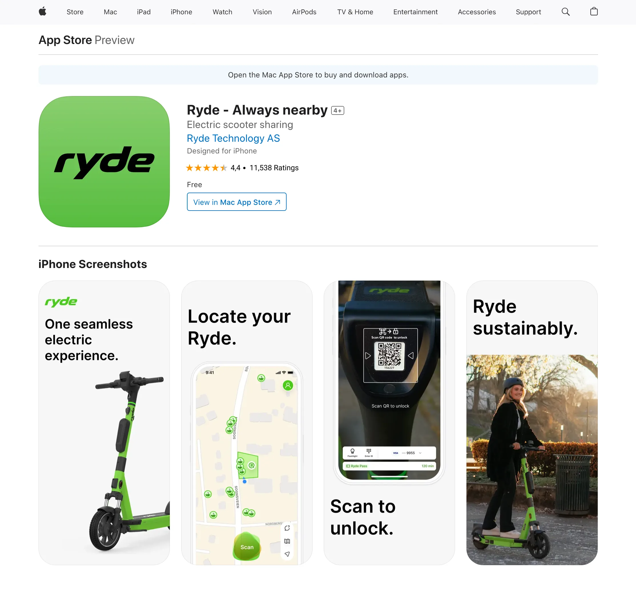 Ryde เป็นบริษัท micromobility ที่ใหญ่ที่สุดของนอร์เวย์ โดยมีพันธกิจในการเปลี่ยนแปลงการคมนาคมในเมือง Ryde มุ่งมั่นที่จะให้บริการที่เป็นกลางต่อสภาพภูมิอากาศและยั่งยืน พร้อมทั้งมีส่วนร่วมกับชุมชนท้องถิ่น