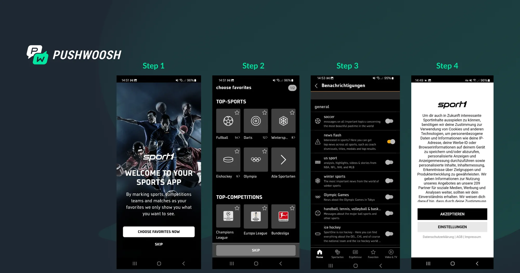 การเปิดแอปและการมีส่วนร่วมกับการแจ้งเตือนแบบพุชมีความสำคัญอย่างยิ่งสำหรับแอปพลิเคชันที่มีโมเดลการสร้างรายได้จากการโฆษณาในแอป SPORT1_ ซึ่งเป็นแพลตฟอร์มกีฬามัลติแชนเนลชั้นนำในประเทศที่พูดภาษาเยอรมัน ได้ใช้ Pushwoosh เพื่อเพิ่มอัตราการเปิดการแจ้งเตือนแบบพุช การมีส่วนร่วมของผู้ใช้ และส่งผลให้รายได้เพิ่มขึ้น_