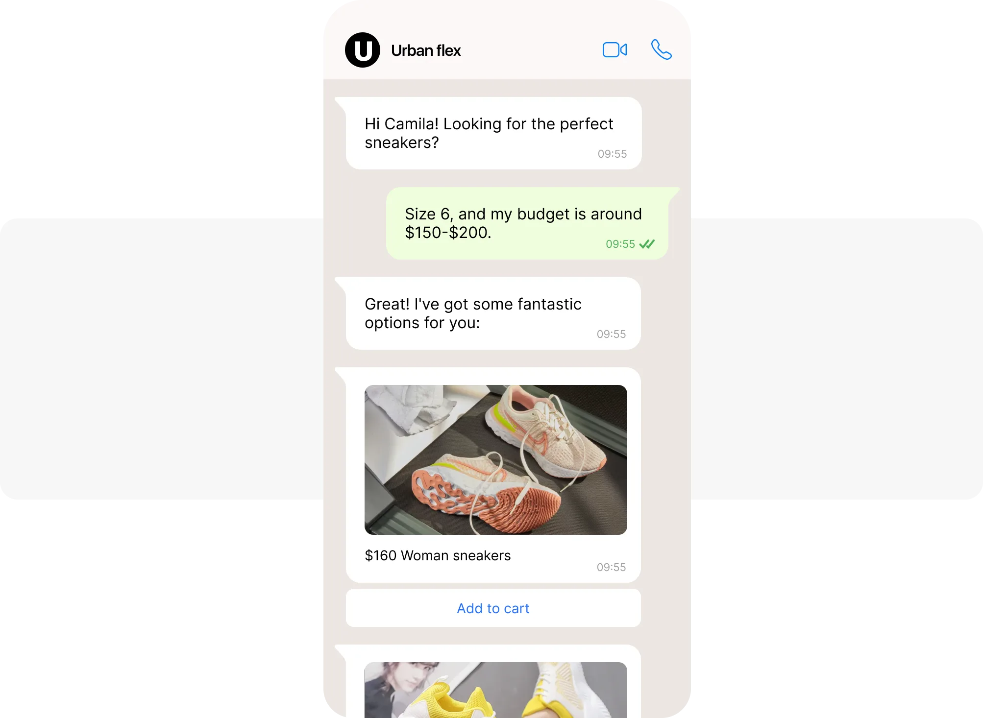- ใช้ WhatsApp เพื่อนำเสนอผลิตภัณฑ์ผ่านแคตตาล็อกสินค้าที่มีสื่อสมบูรณ์แบบ ส่งการแจ้งเตือนตะกร้าสินค้าที่ถูกละทิ้งเพื่อกระตุ้นการซื้อ และจัดการการสนทนาบริการลูกค้าเพื่อประสบการณ์การช็อปปิ้งที่เป็นส่วนตัว