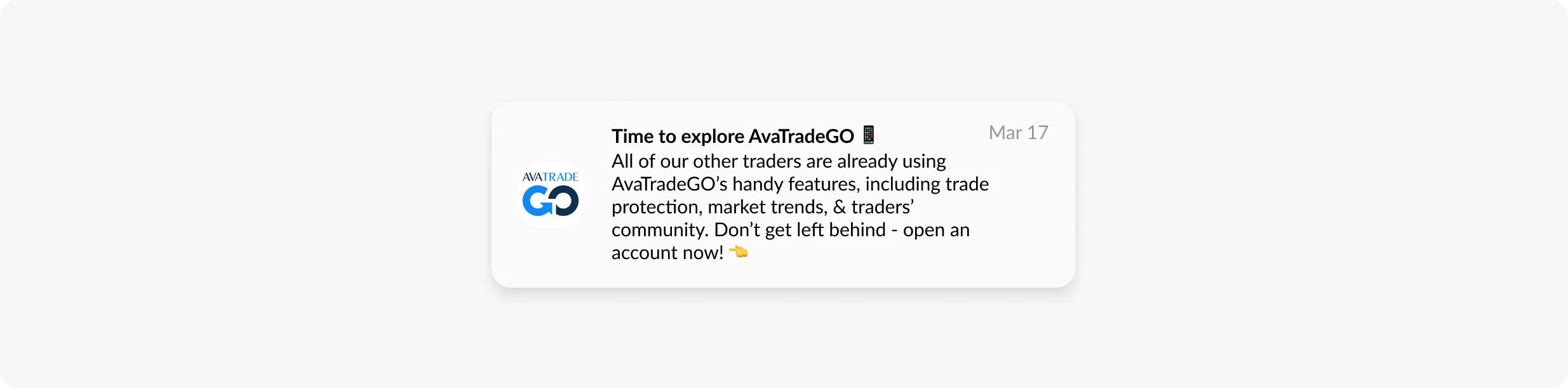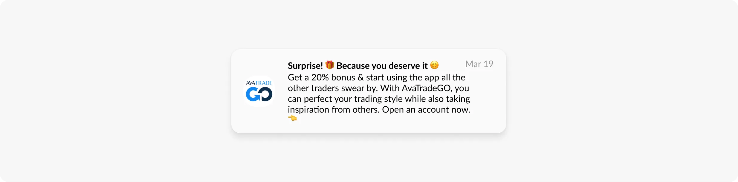 • 个性化激励: 消息突出了 AvaTrade 的独特价值和欢迎奖金,解决了潜在的担忧并促使用户采取行动:
