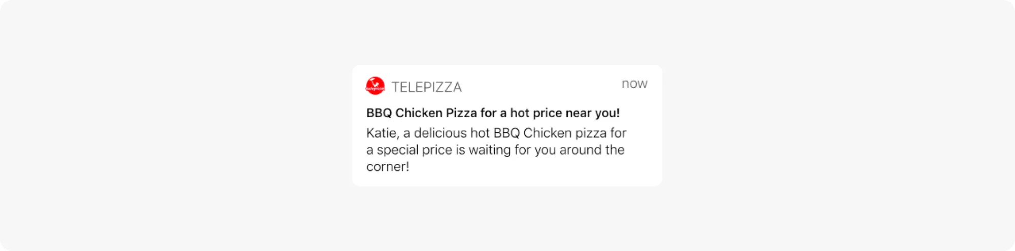 • Telepizza 实施了 Pushwoosh Geozones 功能,以吸引距离餐厅 300-500 米范围内的用户。 • 一旦客户进入定义的地理区域,他们就会收到一条带有特别优惠的推送通知: