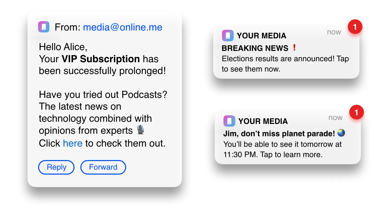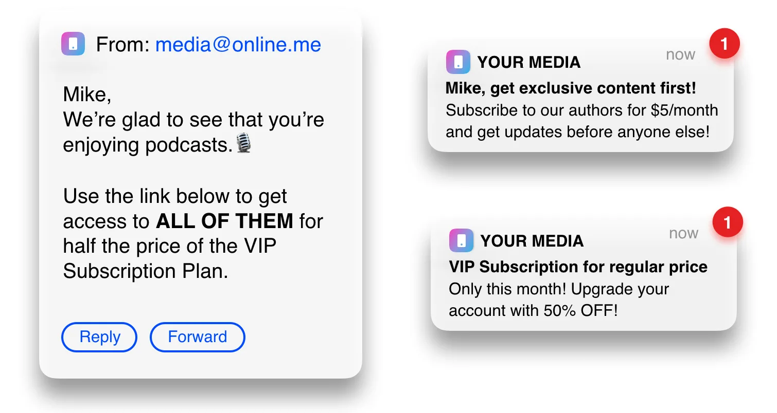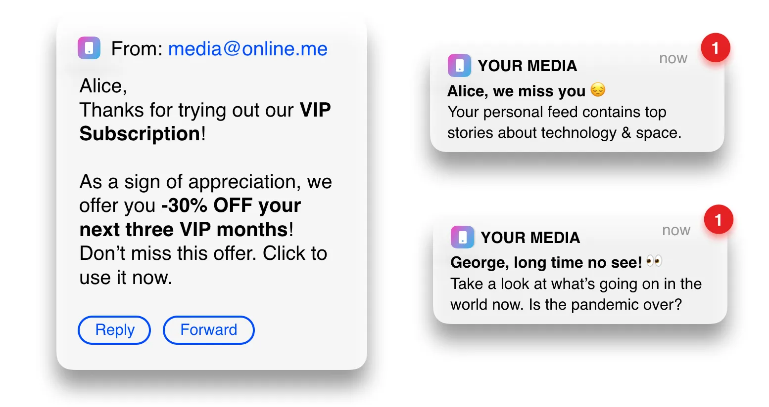 如果您希望订阅者保持活跃,就需要不断改善他们的体验。相关且适时的消息传递是其中的重要组成部分。它能帮助客户随时了解情况,避免疑问和困惑。您可以使用电子邮件发送交易性消息,通过推送通知/电子邮件提供特别优惠和个性化促销,通过应用内消息介绍和展示新功能。