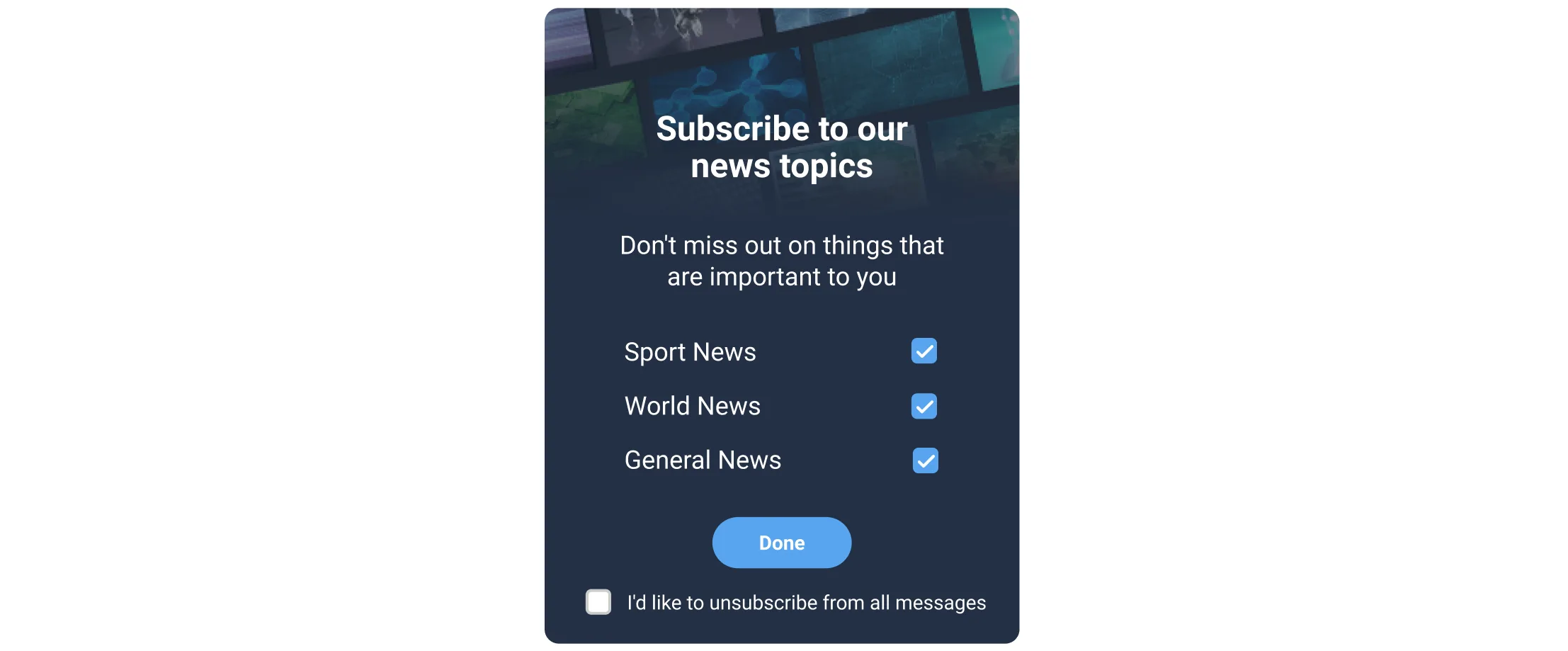 为了获取更多订阅者,您应该通过展示应用内消息来解释接收推送通知的好处。 此外,允许用户选择他们希望接收更新的主题。这样,他们会看到您消息的价值,并知道自己不会被不相关的内容骚扰。